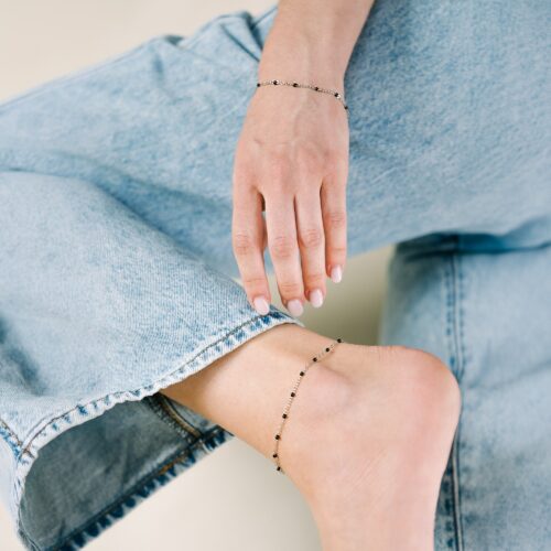 Bransoletka na nogę z czarnymi koralikami srebrna